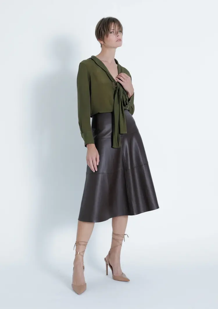 • A timeless leather skirt we are bringing back this Fall in a gorgeous chocolate brown!