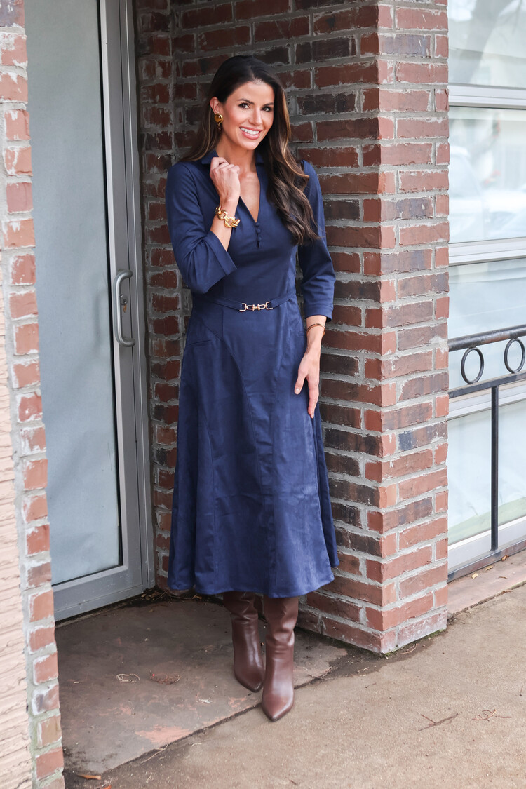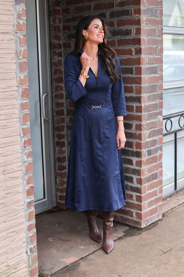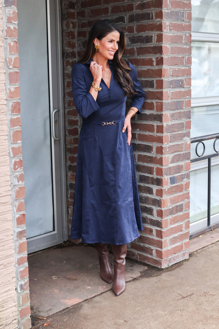 The Victoria Suede Maxi Dress brings sophisticated elegance to your wardrobe. Luxurious suede construction drapes beautifully while the integrated belt cinches your waist for a polished, intentional silhouette.