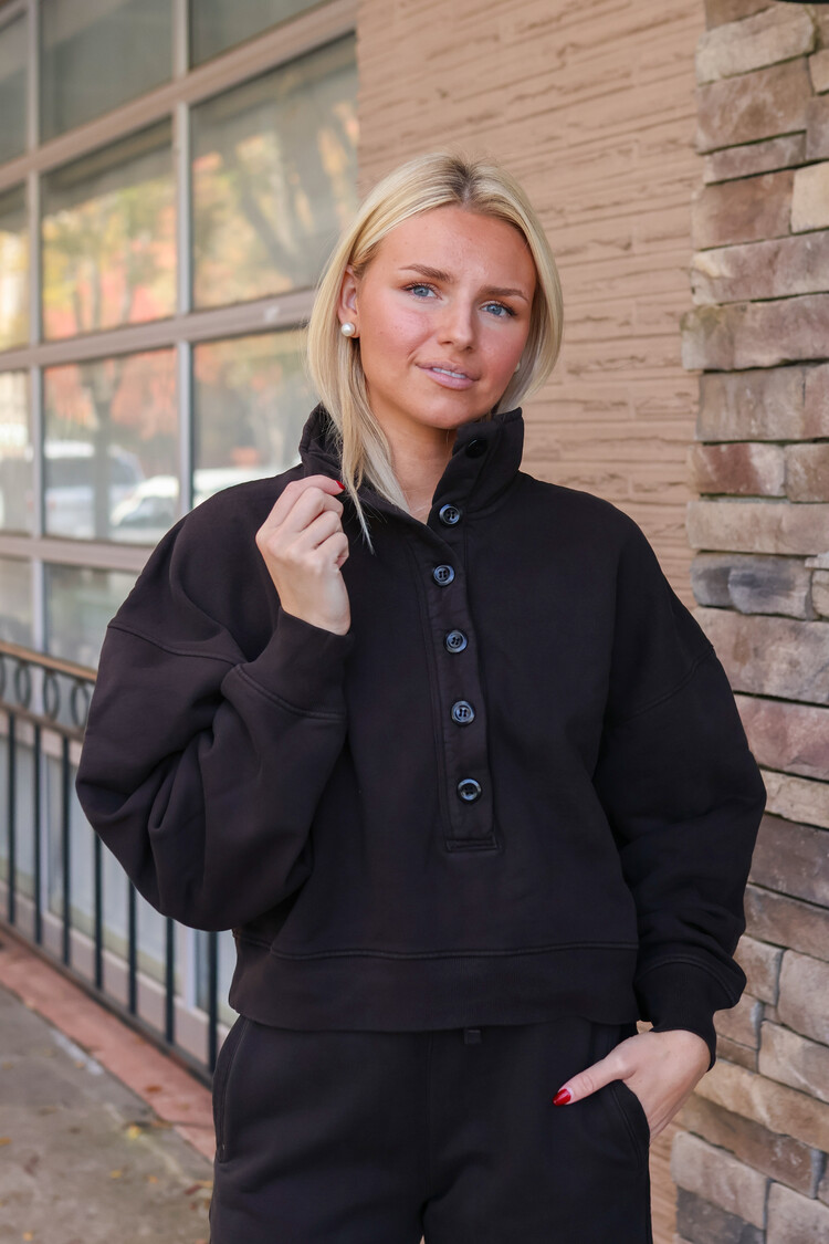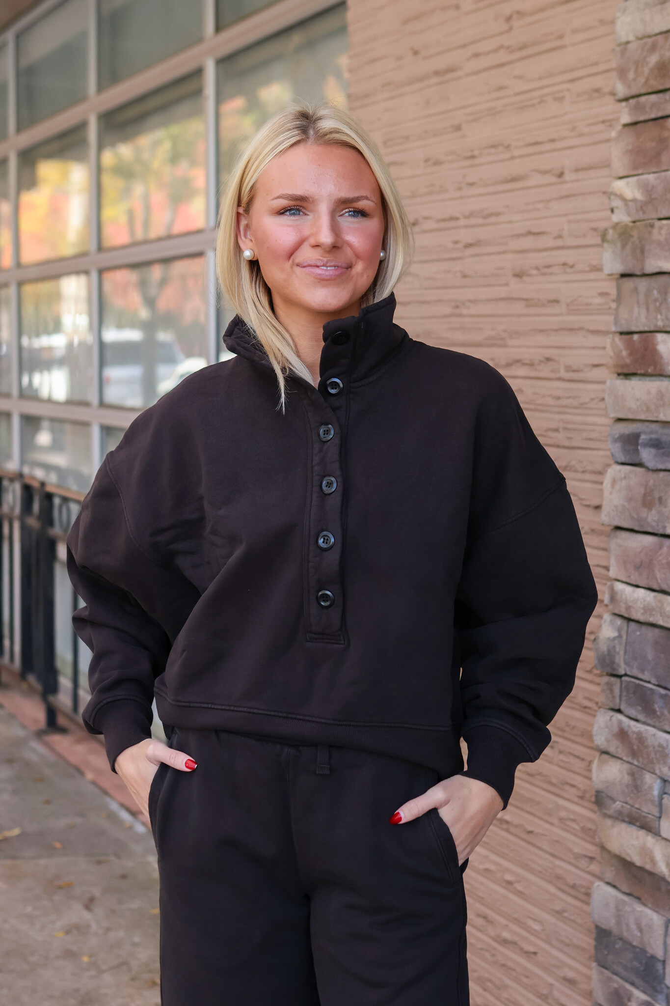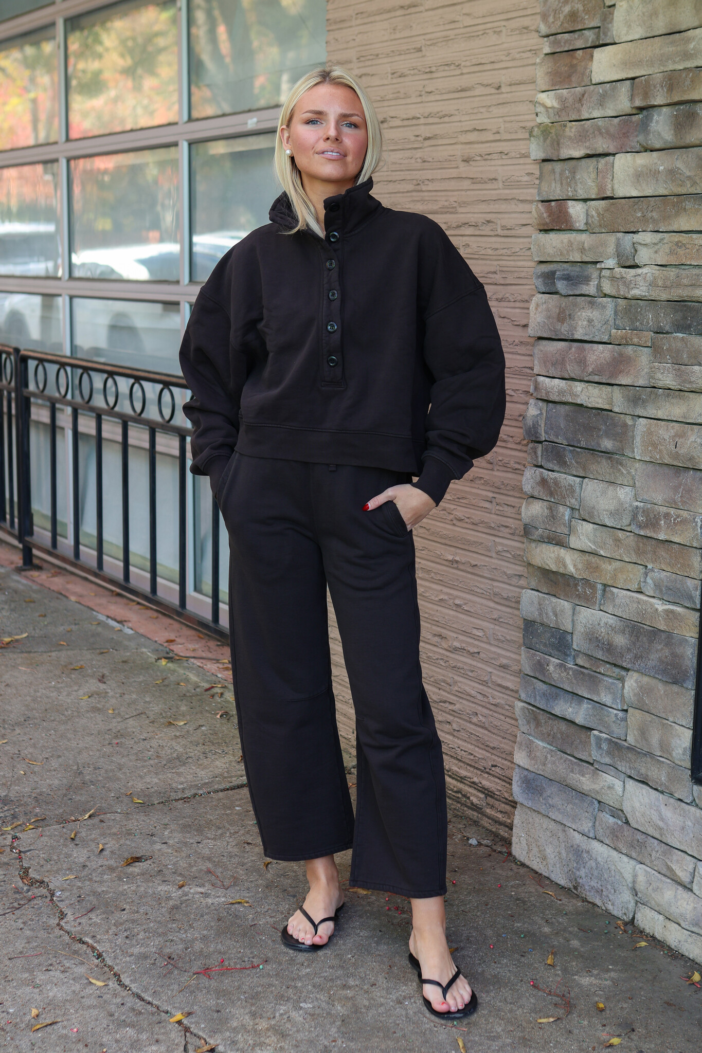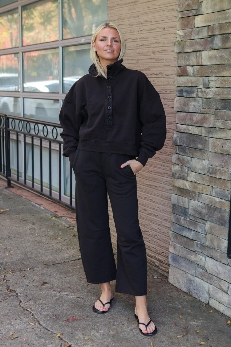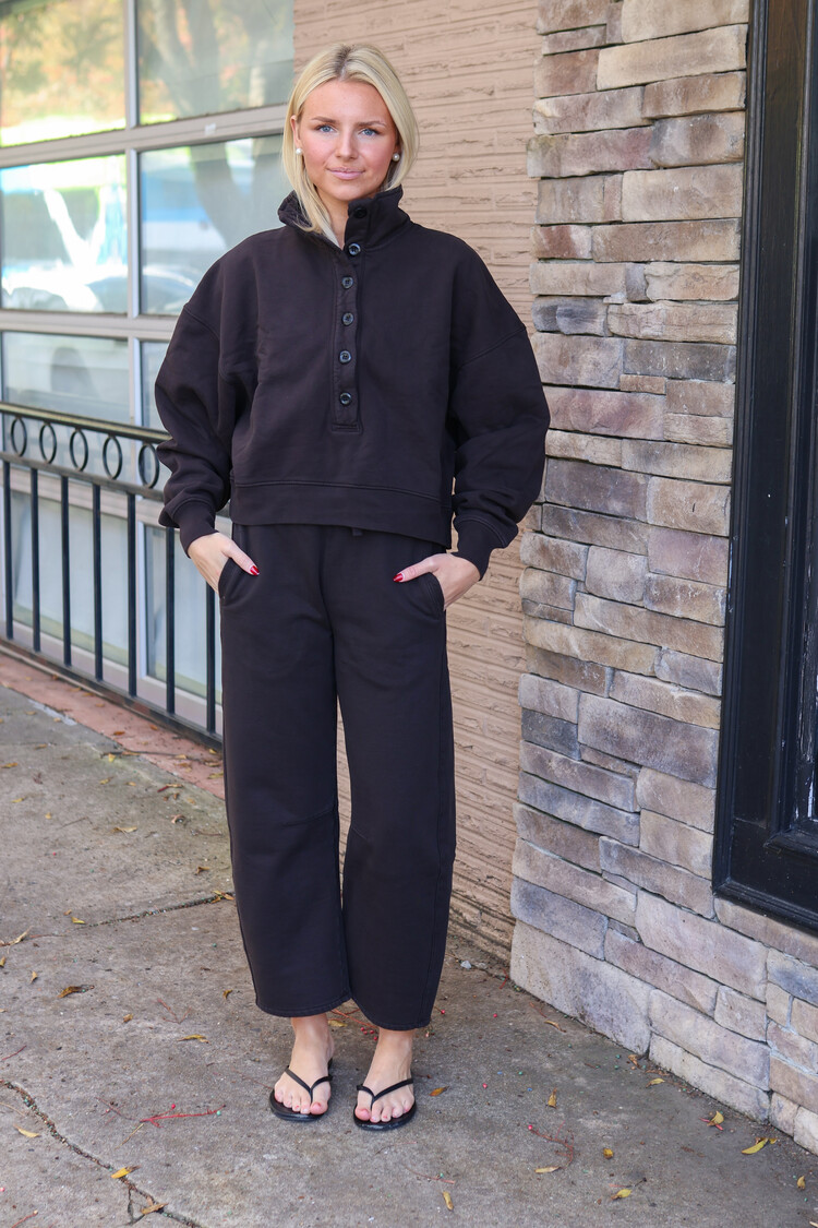 The Miro is crafted from soft brushed fleece with a cozy, plush feel. The medium to dark brown silhouette features a relaxed, tapered fit with a drawstring waist and ankle-length finish. Perfect for lounging styled with matching sweat tops.