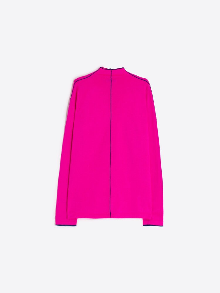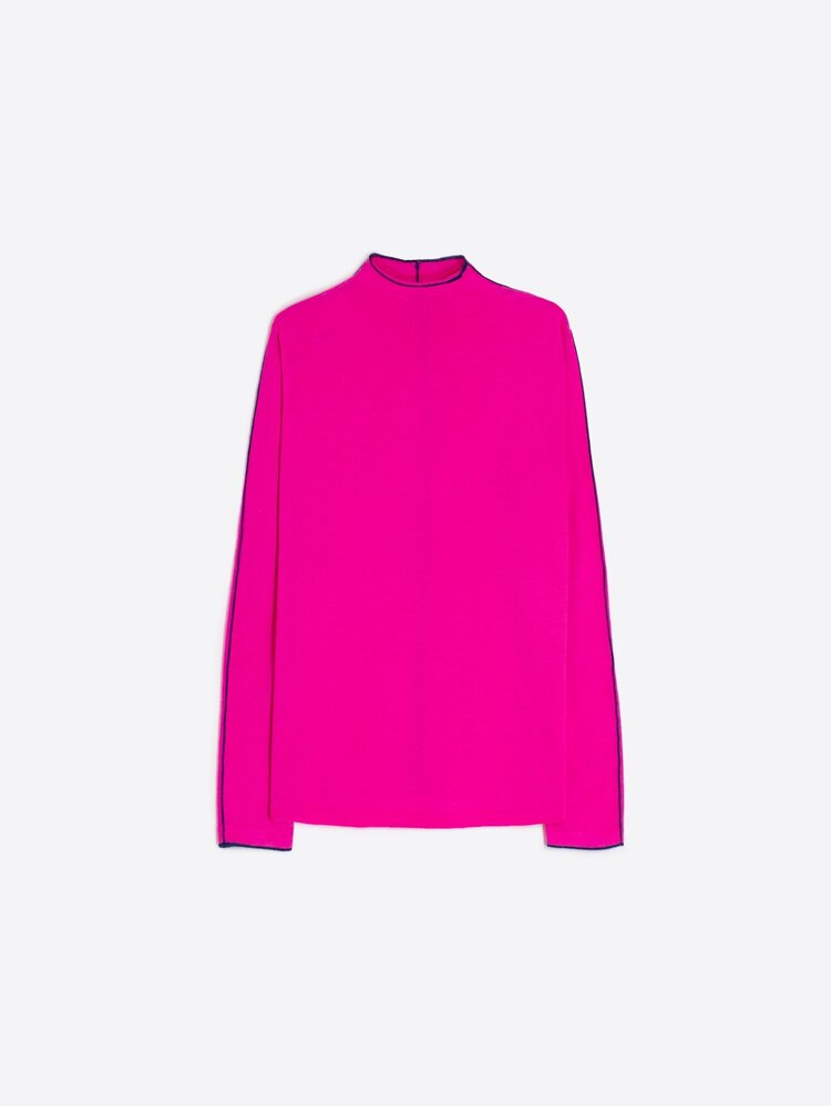• Fuchsia pink sweater in a lightweight wool blend. It features a high neck, straight cut and fluid fabric. Contrasting navy piping highlights the neckline, sleeves and a along the back. The seams are intentionally visible, creating a clean finish.