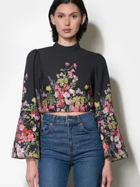 The design is defined by its dramatic bell sleeves, which add volume and movement to the arms, and its flattering crop length, which hits at or above the natural waist. The print keeps the top feeling light and feminine, ideal for social occasions.