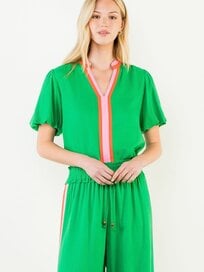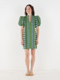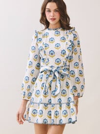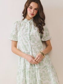 A printed babydoll mini dress featuring a ruffled mock neckline and short puff sleeves with elastic cuffs. Designed with a button-front placket and a relaxed, tiered silhouette. Finished with a softly flared hem for an effortless. 80% Polyester, 20% Cotto