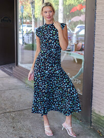 The Gwenyth Dress features a straight silhouette with a midi length and a discreet back slit, providing ease of movement and comfort. Its short sleeves and round neckline make it suitable for casual wear or elevated occasions like a date night.