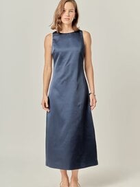 The Gwenyth Dress features a straight silhouette with a midi length and a discreet back slit, providing ease of movement and comfort. Its short sleeves and round neckline make it suitable for casual wear or elevated occasions like a date night.