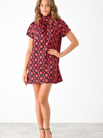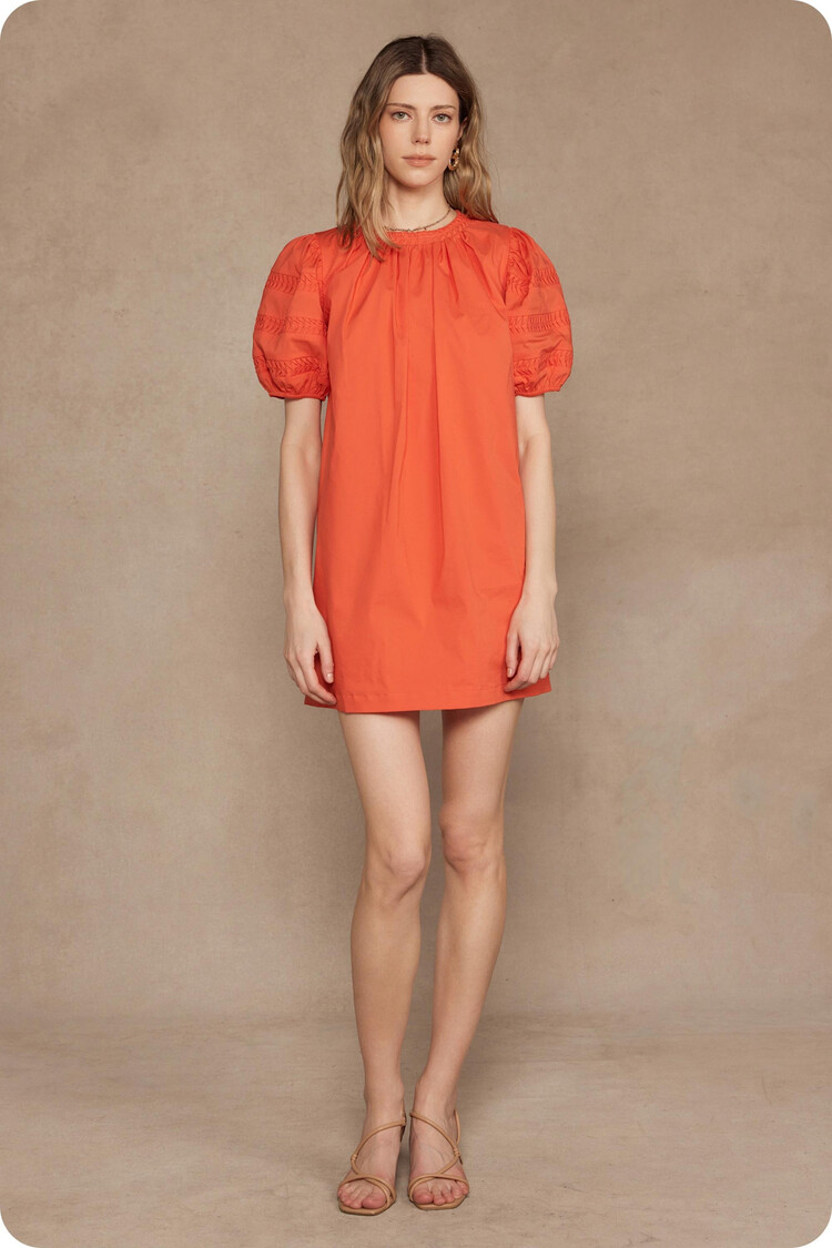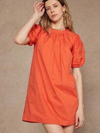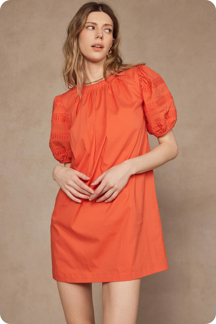 This versatile mini dress features intricate reverse pin-tuck detail at sleeve/neck, shirred shoulders, short puff sleeve with elasticated cuff, side pockets, lining, round neck with shirring detail at front, and keyhole with button closure at back.