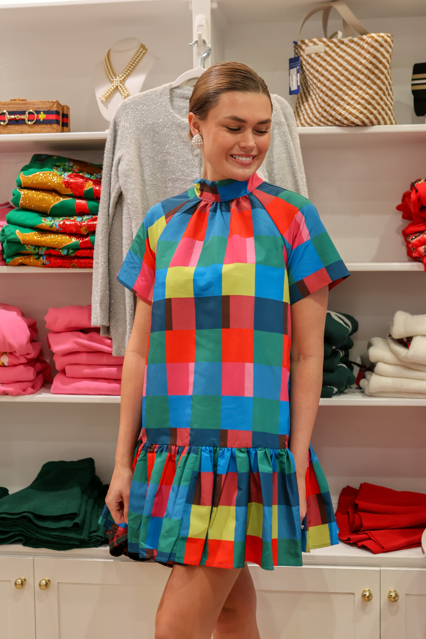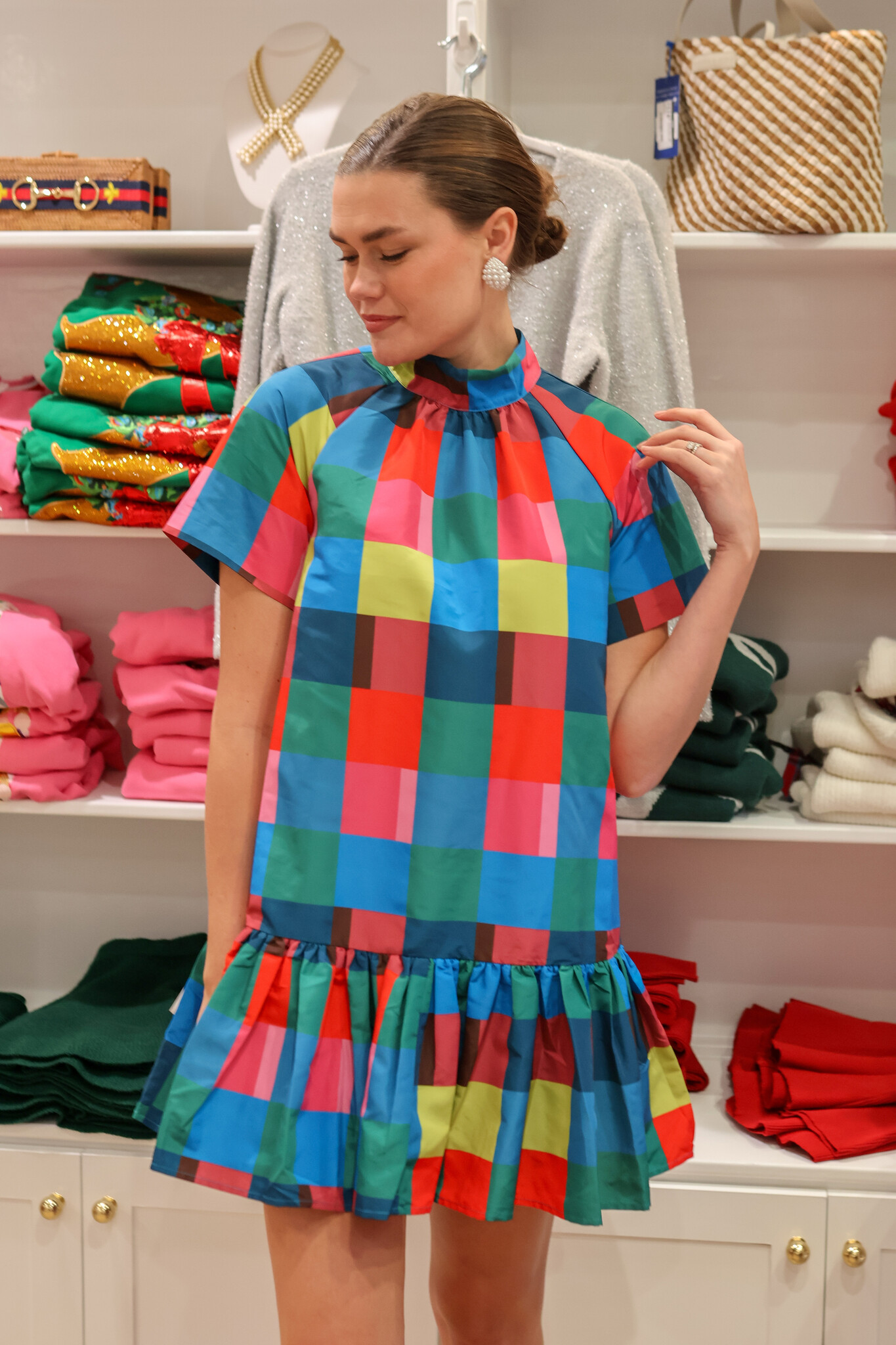 • The Willa Dress in the print toile is a playful yet polished statement piece, featuring a bold checkered pattern and a flirty tiered mini skirt. Its short sleeves and high neckline add a touch of elegance to this modern, feminine silhouette.