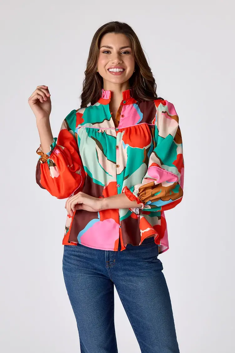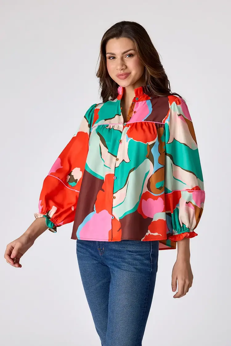 • Our most-loved Worth Blouse returns! Effortlessly feminine with a flowy fit, ruffled neckline, ¾-length puff sleeves, and eye-catching contrast piping, it’s a must-have you’ll reach for again and again.