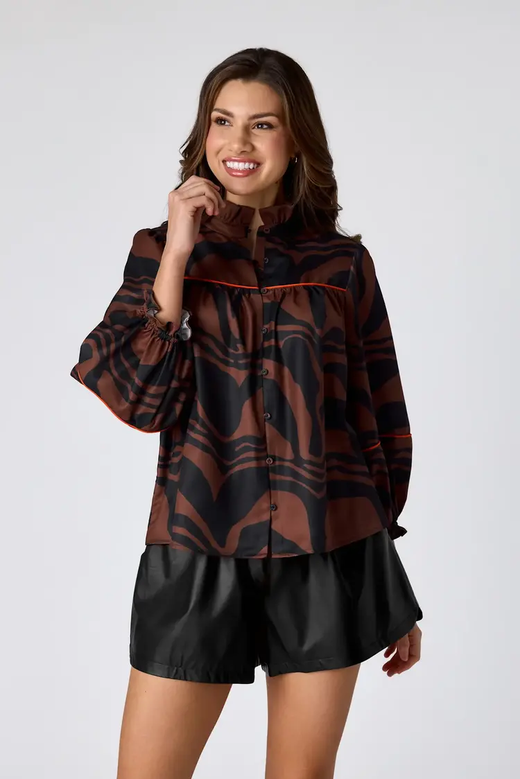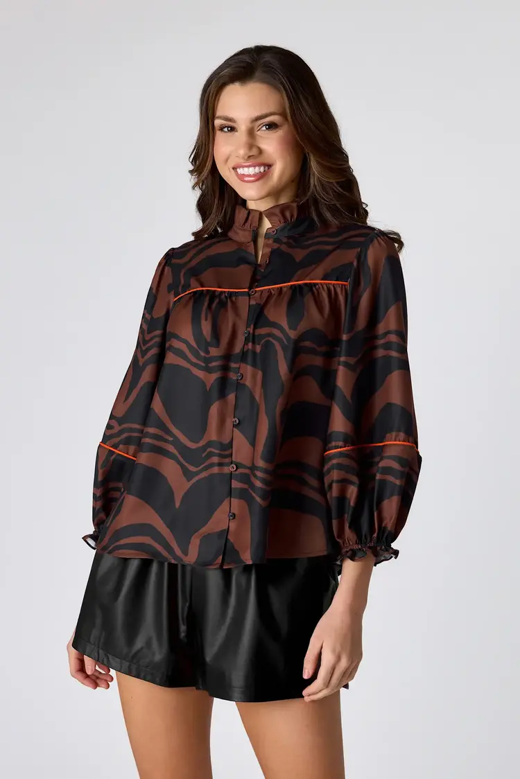 Our most-loved Worth Blouse returns! Effortlessly feminine with a flowy fit, ruffled neckline, ¾-length puff sleeves, and eye-catching contrast piping, it’s a must-have you’ll reach for again and again.
