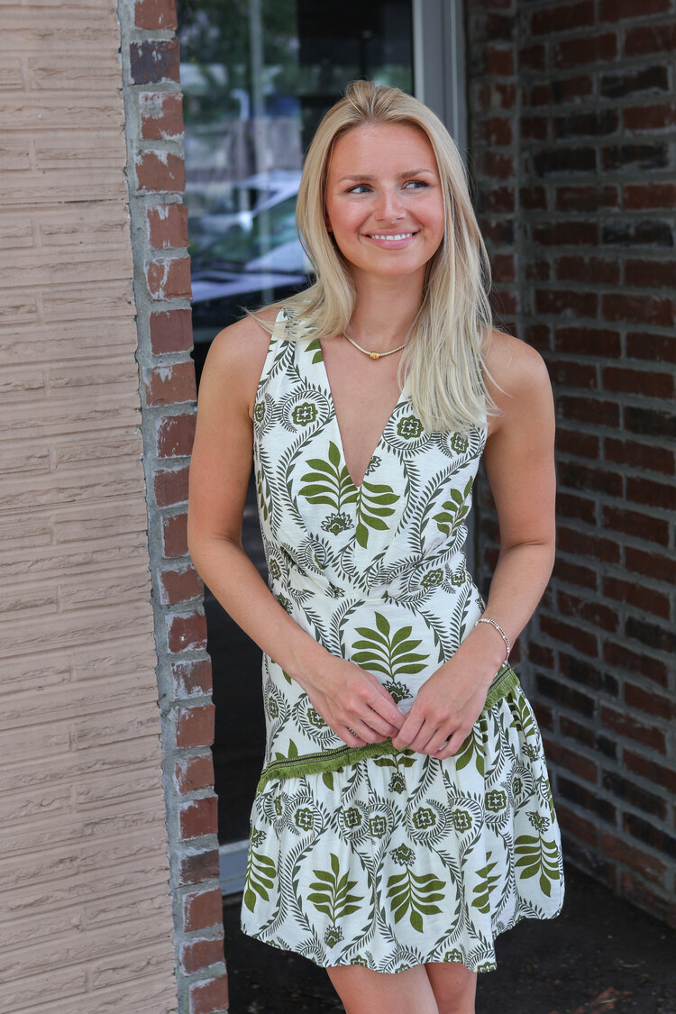 • Featuring a soft halter neckline, this piece flatters with ease while offering a lightweight, breathable feel. The olive botanical print brings vacation energy—no passport required. Finished with a tiered hem and subtle fringe trim for added charm.