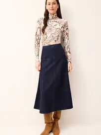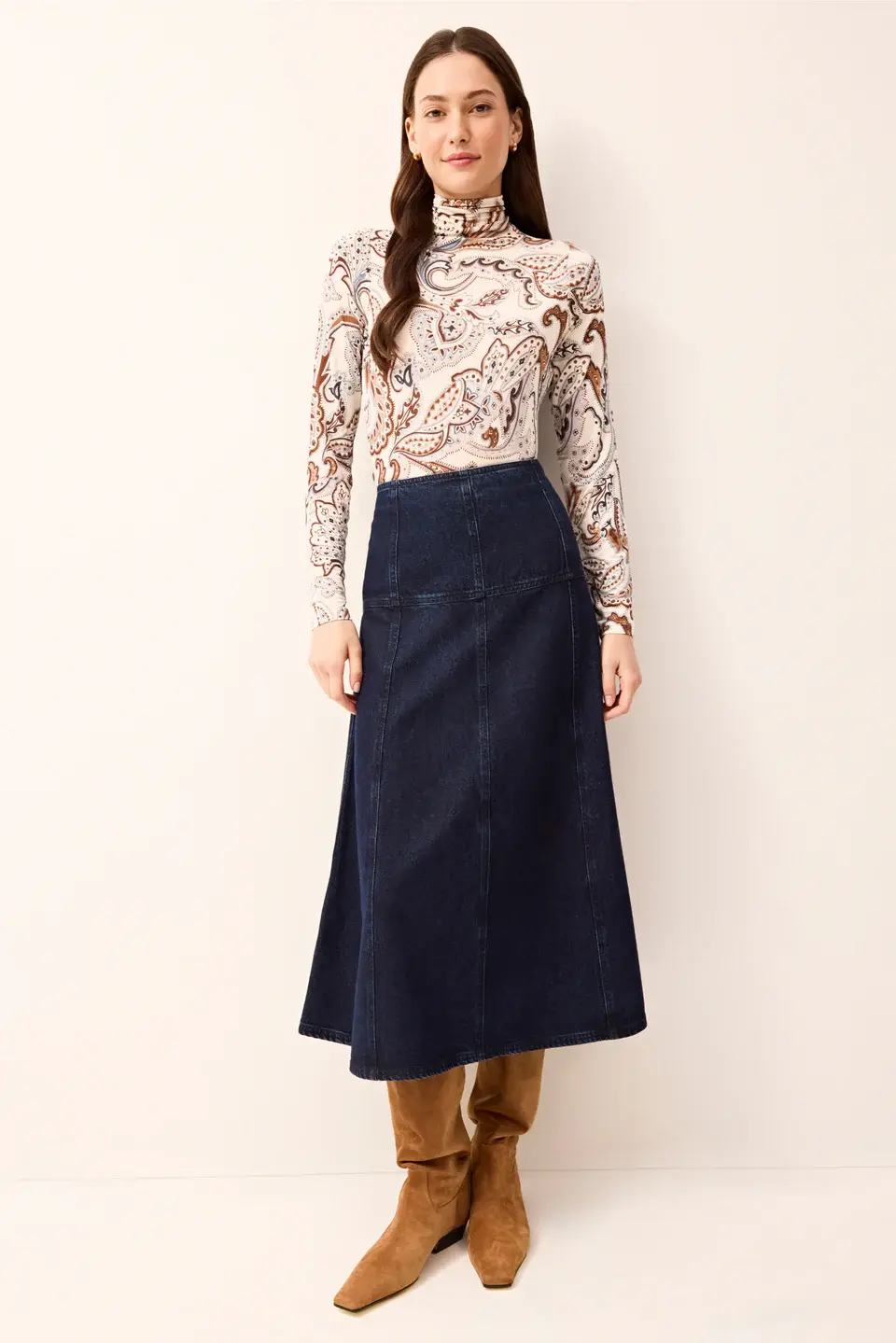 Cut from a soft and pliable dark wash denim, Yuko is fitted through the waist and hips. The A-line midi styles well with boots and sweaters, as well as chic with blouses, so prepare to wear this flattering silhouette on repeat now through spring.