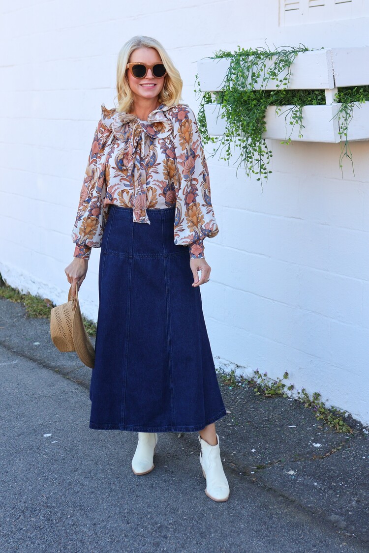 • Cut from a soft and pliable dark wash denim, Yuko is fitted through the waist and hips. The A-line midi styles well with boots and sweaters, as well as chic with blouses, so prepare to wear this flattering silhouette on repeat now through spring.