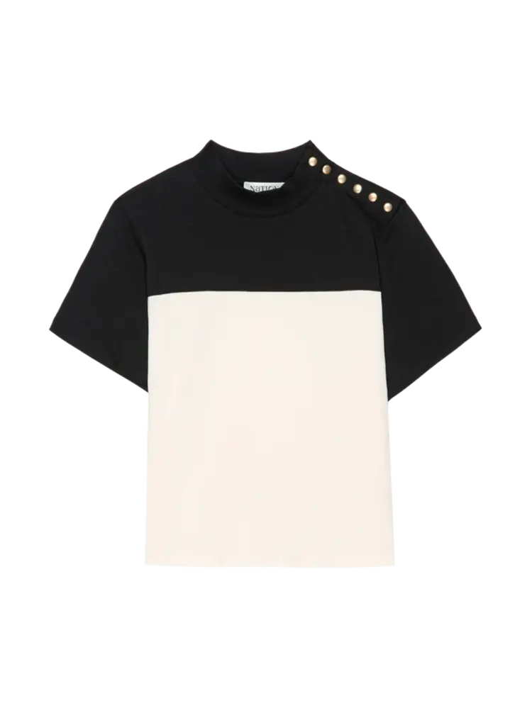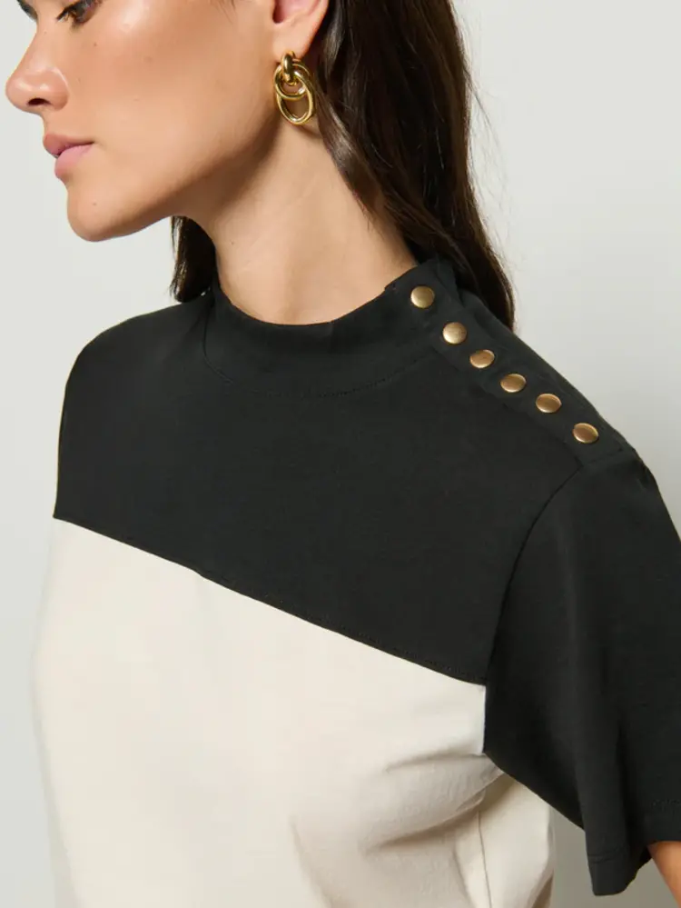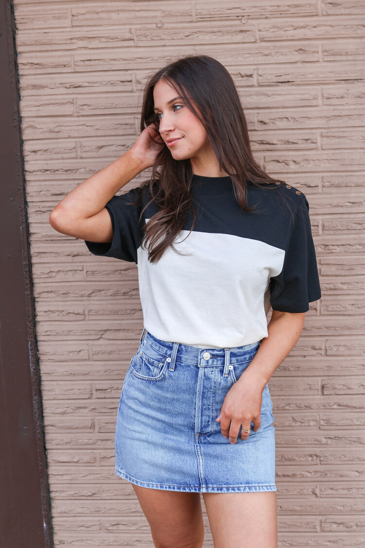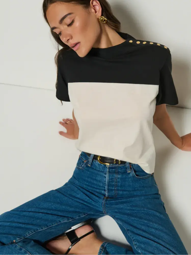 • With a mock, ribbed neckline, front and back yoke, and a functional gold snap closure at the shoulder, this tee is soon to be your seasonless go-to. This one comes in Jet Black Color Block.