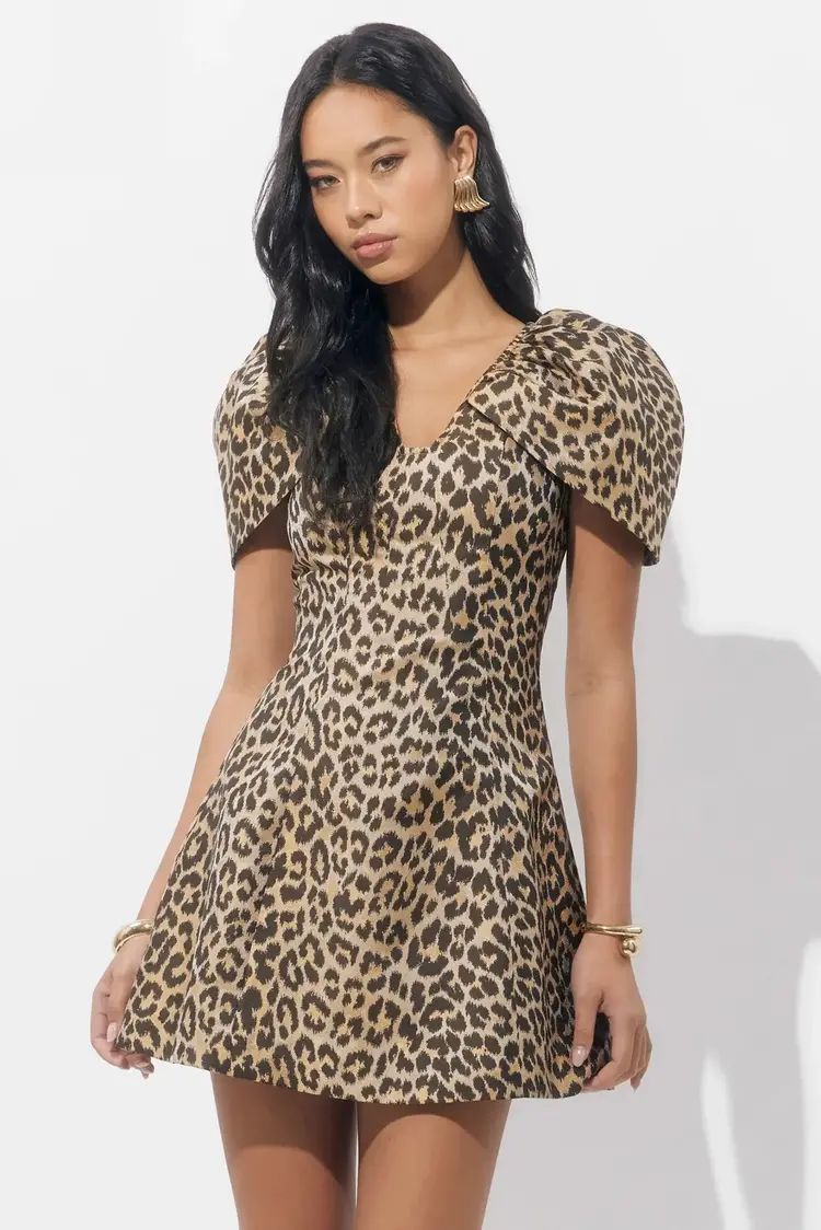 • This dress is crafted from a lightweight fabric with a vibrant brown and black leopard print. It features a high, round neckline and a flattering mini length with a tiered silhouette, giving it a feminine, flowing look.