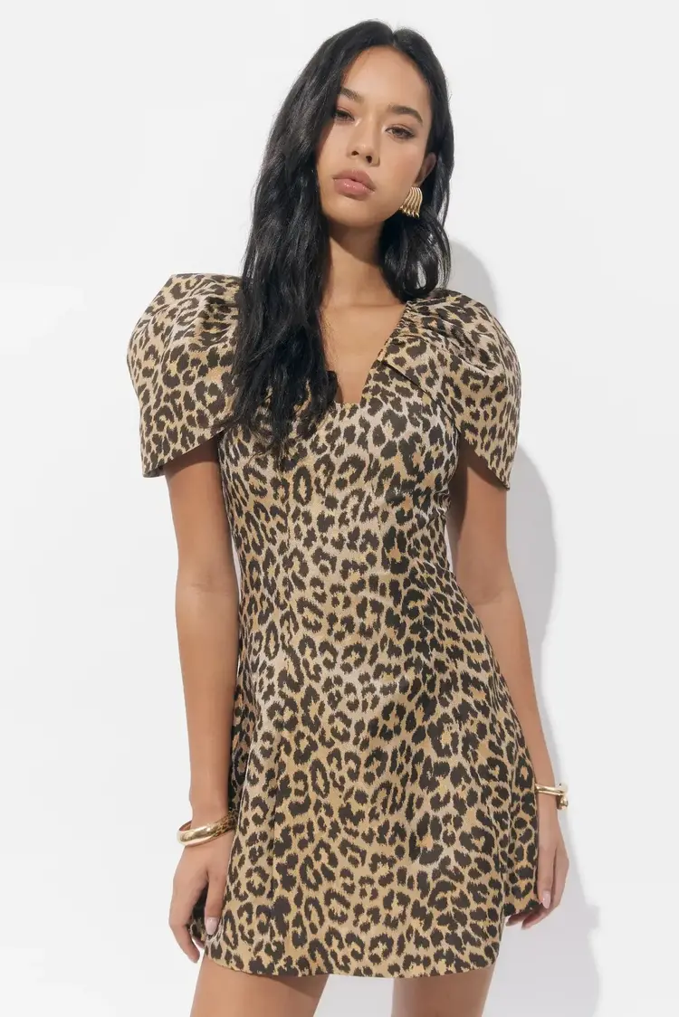 This dress is crafted from a lightweight fabric with a vibrant brown and black leopard print. It features a high, round neckline and a flattering mini length with a tiered silhouette, giving it a feminine, flowing look.