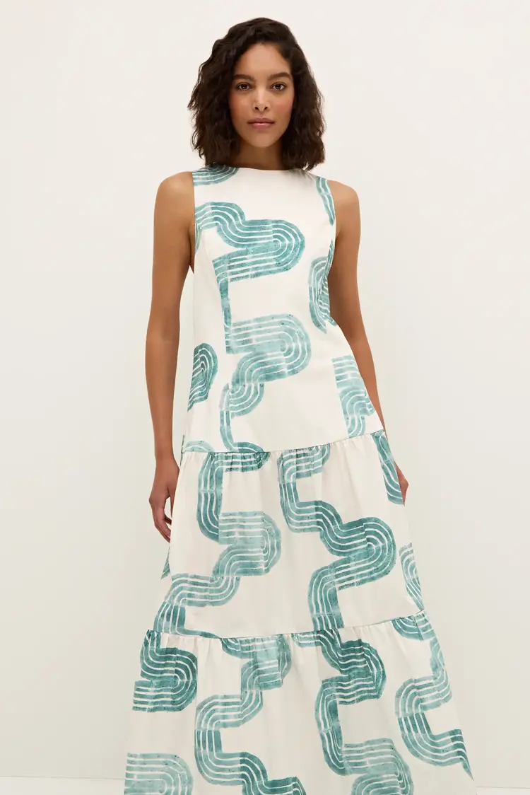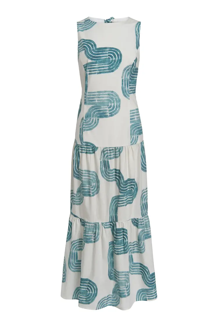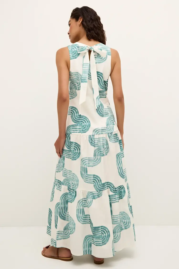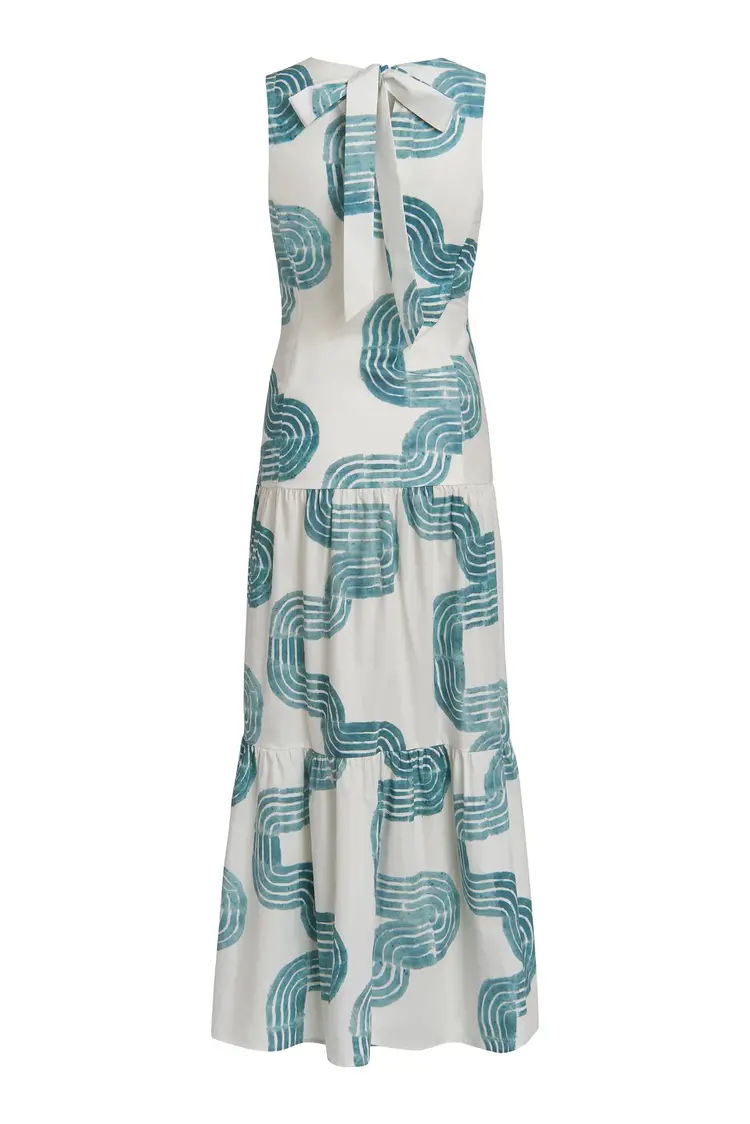 • Cut from a breezy cotton poplin, our new Zelda maxi features the same elegant drop waist and a pretty bow-back as our Marilyn mini—and all the glamour of its Jazz Age namesake. Zelda is pictured here in our new Nile pattern in turquoise and white.
