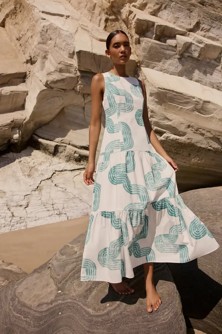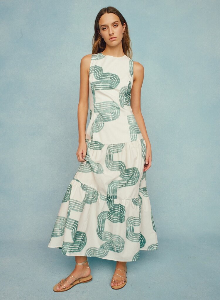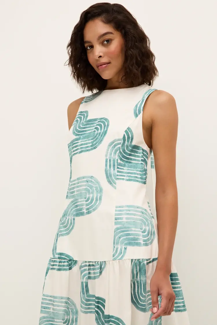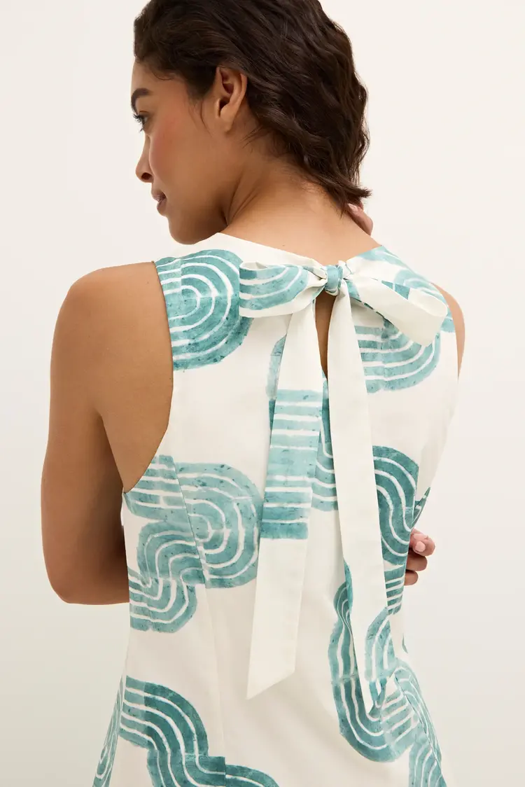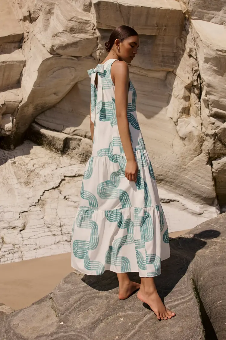 • Cut from a breezy cotton poplin, our new Zelda maxi features the same elegant drop waist and a pretty bow-back as our Marilyn mini—and all the glamour of its Jazz Age namesake. Zelda is pictured here in our new Nile pattern in turquoise and white.