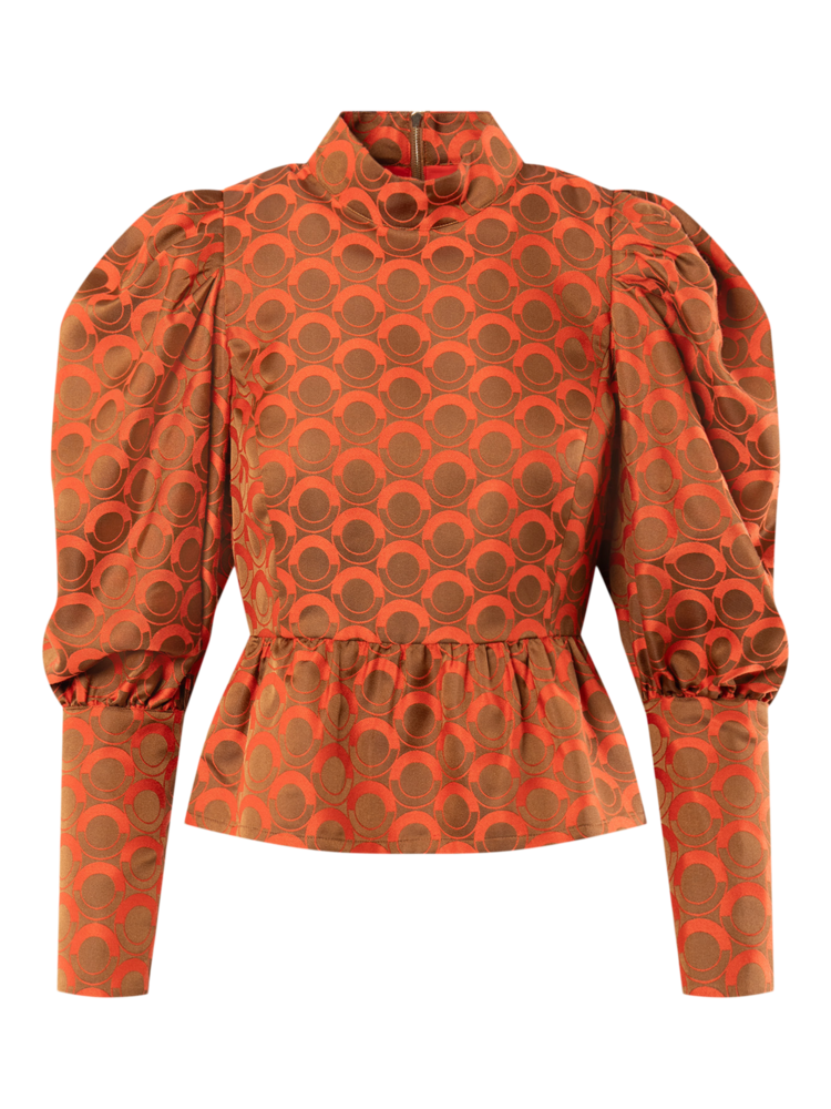 • The Zoe Top in Tangerine Mod blends vintage inspiration with a modern, tailored fit. Featuring a structured mock neckline, puff sleeves, and a feminine peplum hem, this style is finished with an exposed gold zip closure at the back for a refined touch.