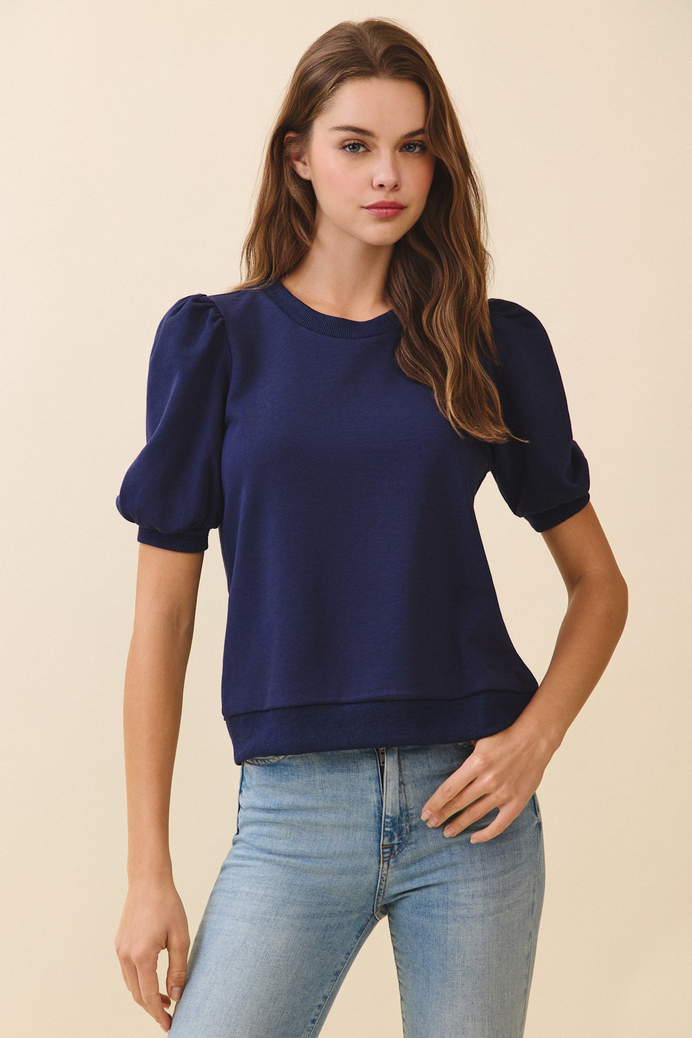 A knit top featuring a crew neckline, short puff sleeves with gathered shoulders, and ribbed cuffs and hem for a polished fit.